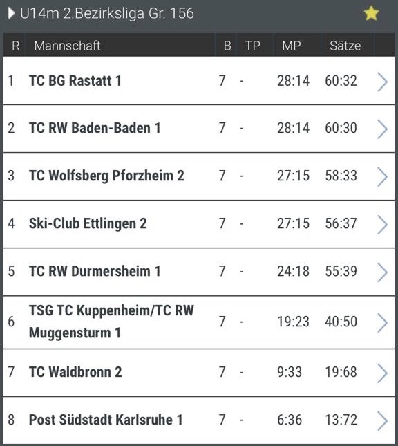 Überraschungen am letzten Spieltag: RW Baden-Baden holt nur Matches gegen Waldbronn, Ettlingen spielt gegen Pforzheim 3:3! Damit sind wir MEISTER in der 2. Bezirksliga! Unser 5:1 Sieg gegen Baden-Baden bringt uns bei Punktgleichheit im direkten Vergleich den Titel!!!